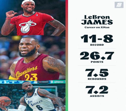 北京时间明日,一年一度的NBA圣诞大战即将打响。今日,美媒晒出了湖人球星勒布朗-詹姆斯的圣诞大战数据。詹姆斯...