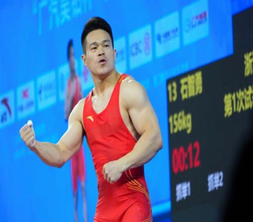11月17日,浙江队选手石智勇在抓举比赛中试举成功后庆祝。他获得冠军。