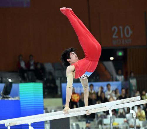 体操赛场,湖南名将张博恒以一套干净利落的动作问鼎男子单杠;四川队邹敬园则加冕男子双杠。