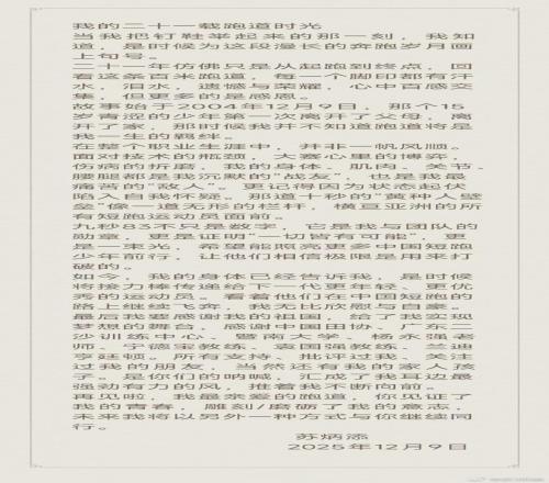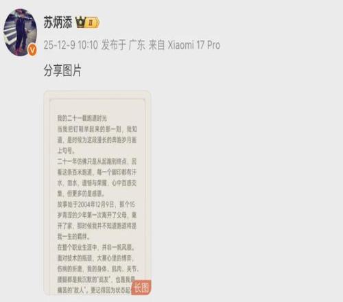 刚刚(12月9日),男子100米亚洲纪录保持者、中国短跑名将苏炳添发布微博宣布退役。全文如下:2025年11月20日,36岁的...